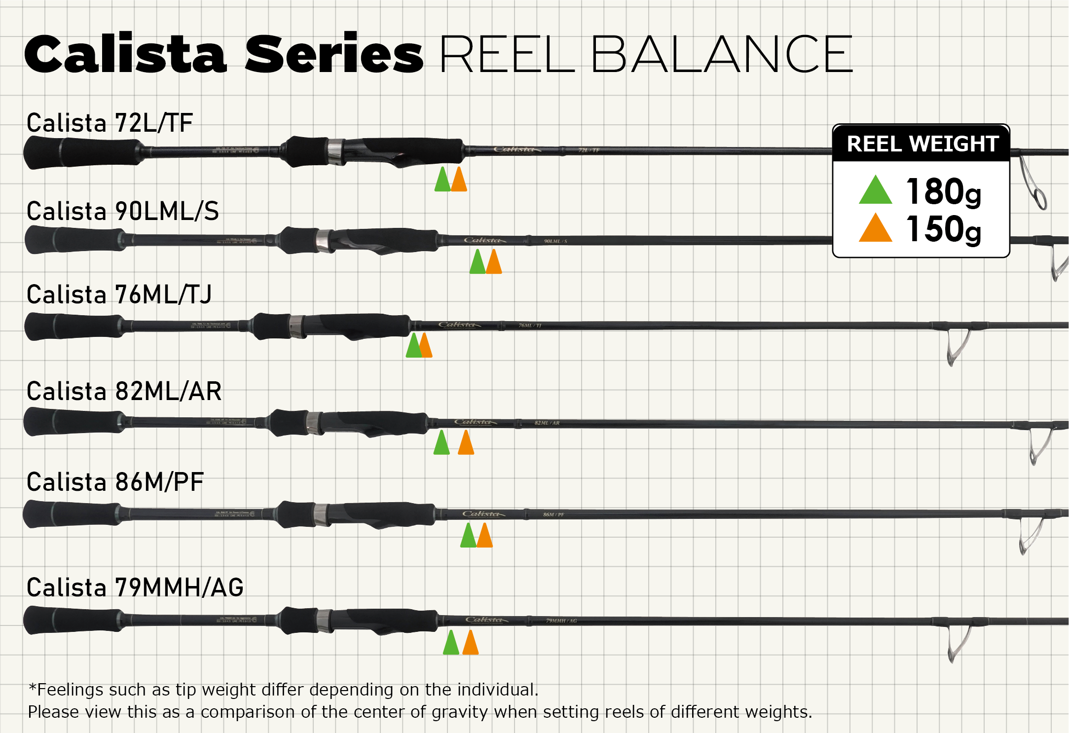 This mark shows the balance point when a reel is equipped. It does not represent a recommended reel weight, so please use it only as a reference for overall tackle balance.
