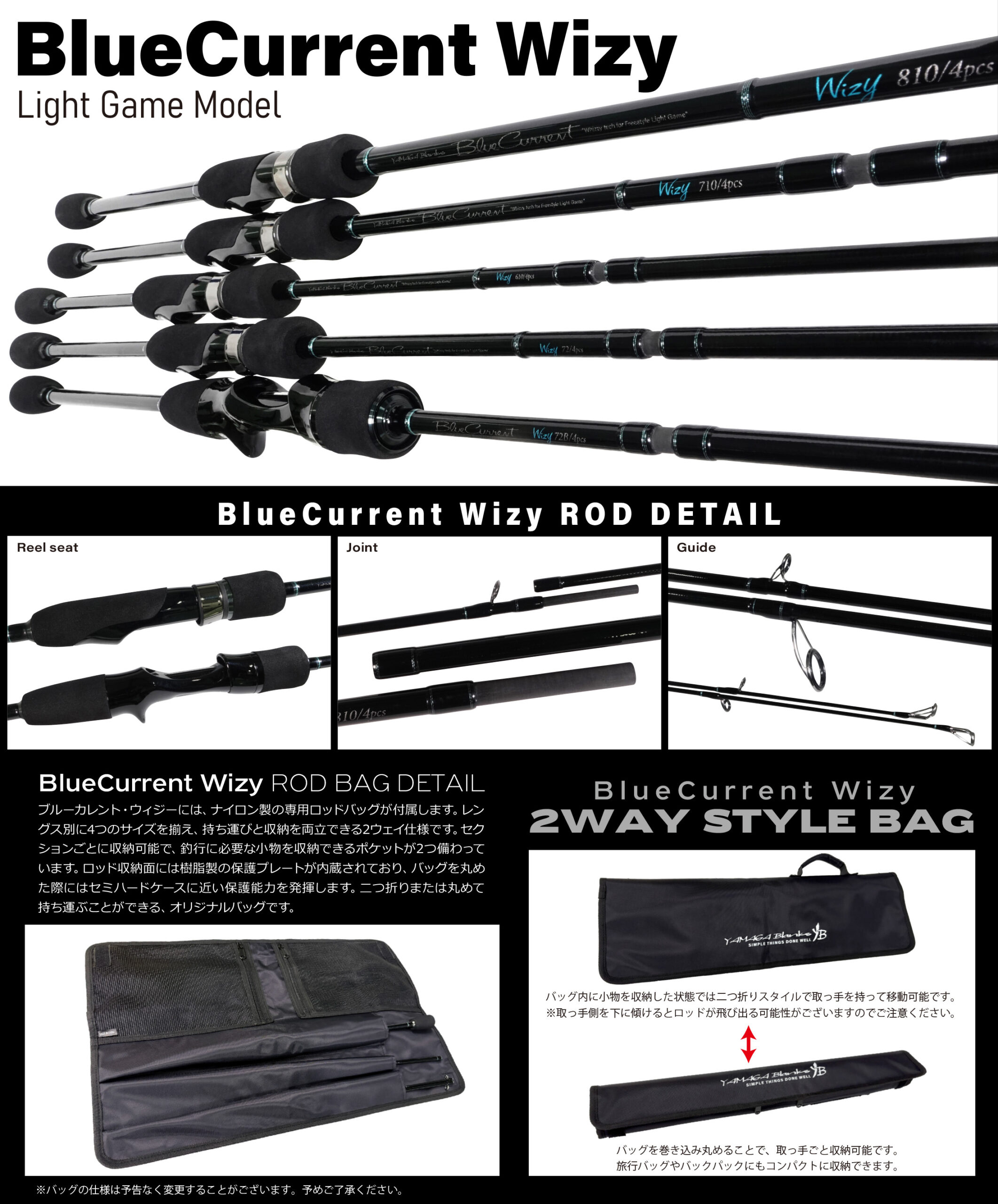 共通のブランクを使用しており、ボート・ショア問わず取り回しの良さと、ルアーの高い操作レスポンスに特化したモデルです。Wizy710よりも、全体的な張り感を強めに設計しています。