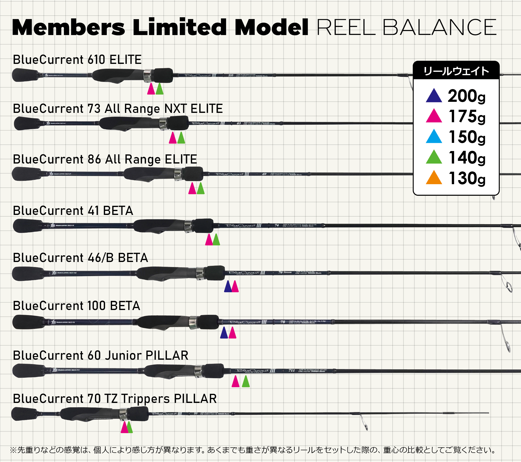 NEW DAWNモデルにリールをセットしたときの重心をマークしました。異なるウェイトのリールをセットした重心も記載しています。推奨のリールウェイトというわけではございませんので、あくまでもタックルバランスの参考としてご覧ください。