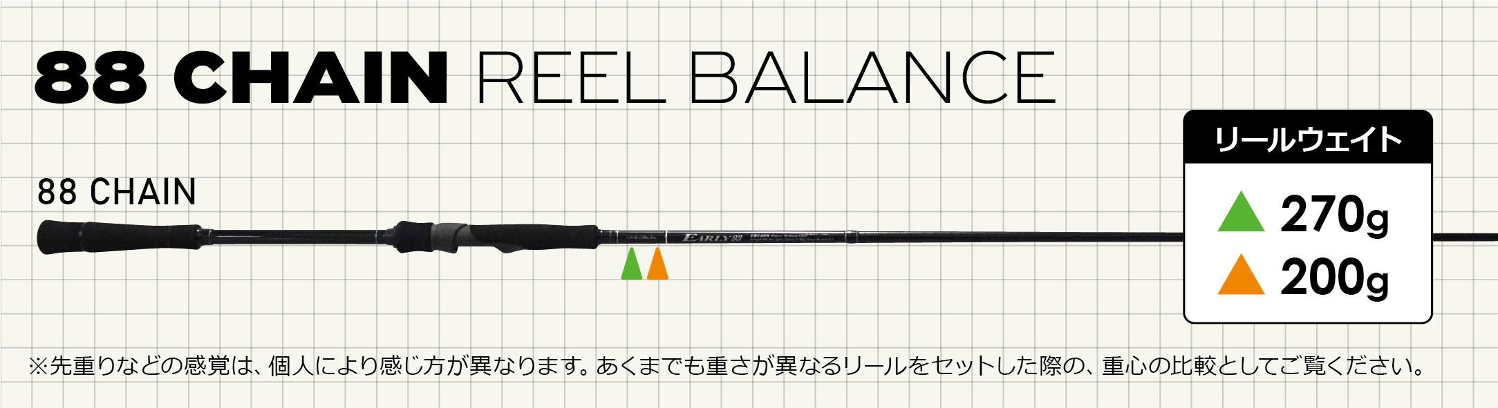 88 CHAINにリールをセットしたときの重心をマークしました。異なるウェイトのリールをセットした重心も記載しています。推奨のリールウェイトというわけではございませんので、あくまでもタックルバランスの参考としてご覧ください。